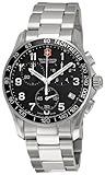 A versatile timepiece that's ideal for daily wear, the Swiss Army Men's Chrono Classic Watch offers a refined, black circular dial with white Arabic numeral hour indexes, luminous silver-toned hands, and a discreet date display at four o'clock. The three subdials offer full chronograph function while a black-plated, stainless steel bezel is inscribed with a tachymeter. Paired with an ultra scratch-resistant, anti-reflective sapphire crystal, the stainless steel case protects the dial and provides durability. The classic, stainless steel bracelet is secured with a deployment clasp. This watch is water resistant to 330 feet (100 meters) and is equipped with precise Swiss quartz movement.